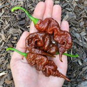 This scorcher is considered by many to be the hottest pepper out there, although it has not been made official. This chocolate variant comes from the original red cross between a 7 Pot Primo and a Fatalii by Chris Saunders in the UK in 2012.